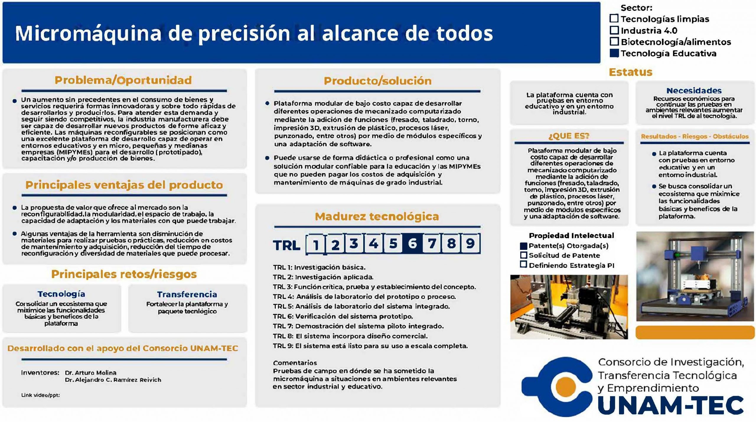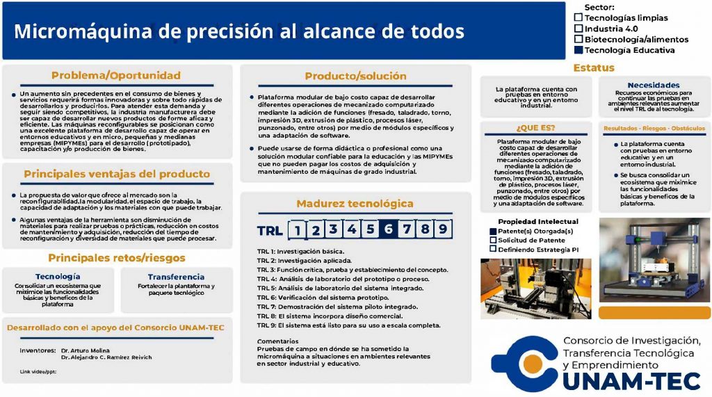 Esta micromáquina CNC (Control Numérico Computarizado) modular de bajo costo permite realizar múltiples procesos —fresado, taladrado, impresión 3D o corte láser—. Su diseño adaptable y su software flexible ofrecen a pequeñas empresas y centros educativos una alternativa accesible para formar talento, innovar y producir sin depender de maquinaria industrial costosa.